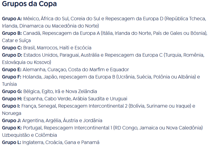 O Brasil está ao lado de Marrocos, Escócia e Haiti no Grupo C da Copa do Mundo de 2026, que será disputada nos Estados Unidos, no México e no Canadá. A chave da seleção brasileira na competição, que será realizada entre 11 de junho e 19 de julho de 2026, foi definida nesta sexta-feira (5) através de sorteio realizado no Kennedy Center, em Washington (Estados Unidos). A estreia do time comandado pelo técnico italiano Carlo Ancelotti será no dia 13 de junho, diante dos marroquinos, ainda em local a ser definido.