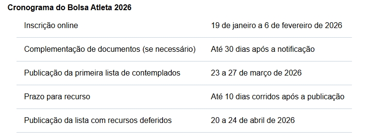 O Governo do Brasil, por meio do Ministério do Esporte, publicou, no Diário Oficial da União, o edital do Programa Bolsa Atleta, que regulamenta a concessão do benefício para o próximo ciclo. As inscrições começam no próximo dia 19 de janeiro e seguem até 6 de fevereiro de 2026, com previsão de publicação da primeira lista de atletas contemplados entre 23 e 27 de março. O cronograma também prevê prazo para complementação de documentos, interposição de recursos e divulgação da lista final até o fim de abril.