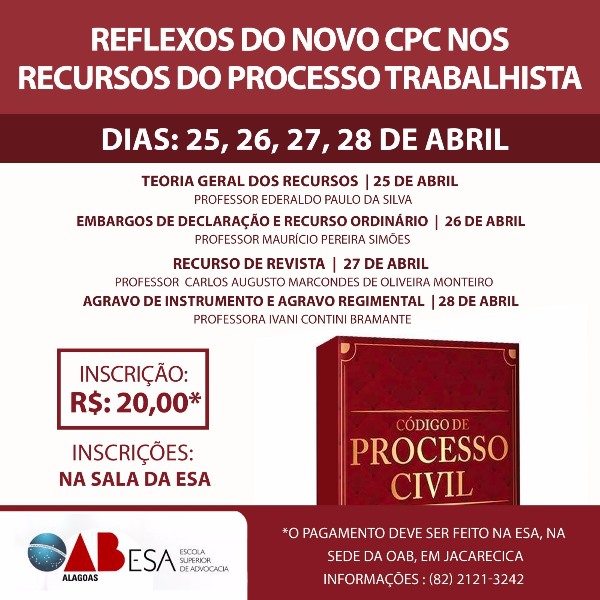 O mês de abril segue com muitas atividades realizadas pela Escola Superior de Advocacia (ESA). Nos próximos dias 25, 26, 27, 28 de abril, acontecem com carga horário de 8 horas o curso telepresencial com o tema “Reflexos do Novo CPC nos Recursos do Processo Trabalhista”. As aulas serão realizadas na sala de aula da ESA, que fica na sede da Ordem dos Advogados do Brasil Seccional Alagoas (OAB/AL), em Jacarecica, e começam às 19 horas.