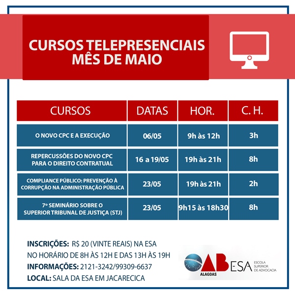 A Escola Superior de Advocacia (ESA) começa maio com a divulgação de mais quatro cursos telepresenciais que serão transmitidos na sede da Ordem dos Advogados do Brasil Seccional Alagoas (OAB/AL), em Jacarecica. Os cursos são voltados para o Novo Código de Processo Civil, Prevenção a Corrupção na Administração Pública e atuação do Superior Tribunal de Justiça (STJ).