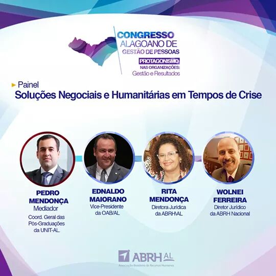 Maiorano e Rita foram convidados para participar do painel referente às Relações de Trabalho. O vice-presidente da OAB irá tratar sobre ‘A visão sindical e a visão do Judiciário Alagoano sobre a crise e as soluções negociais’. Já a advogada deverá tratar da temática ‘Lei de Cotas para Pessoas com Deficiência: avanços, desafios e perspectivas’. O evento é uma organização da Associação Brasileira de Recursos Humanos de Alagoas (ABRH/AL).