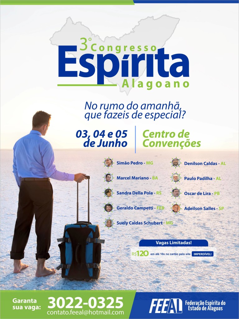 Em meio à crise que assola o país e o mundo, na atualidade, a Federação Espírita do Estado de Alagoas - Feeal convida todos a fazerem uma reflexão mais profunda sobre si mesmos, dentro do contexto de transformações que estão por acontecer no processo natural de evolução da humanidade. Vem aí o 3º Congresso Espírita Alagoano, nos dias 3, 4 e 5 de junho, com o tema “No rumo do amanhã, que fazeis de especial?”.