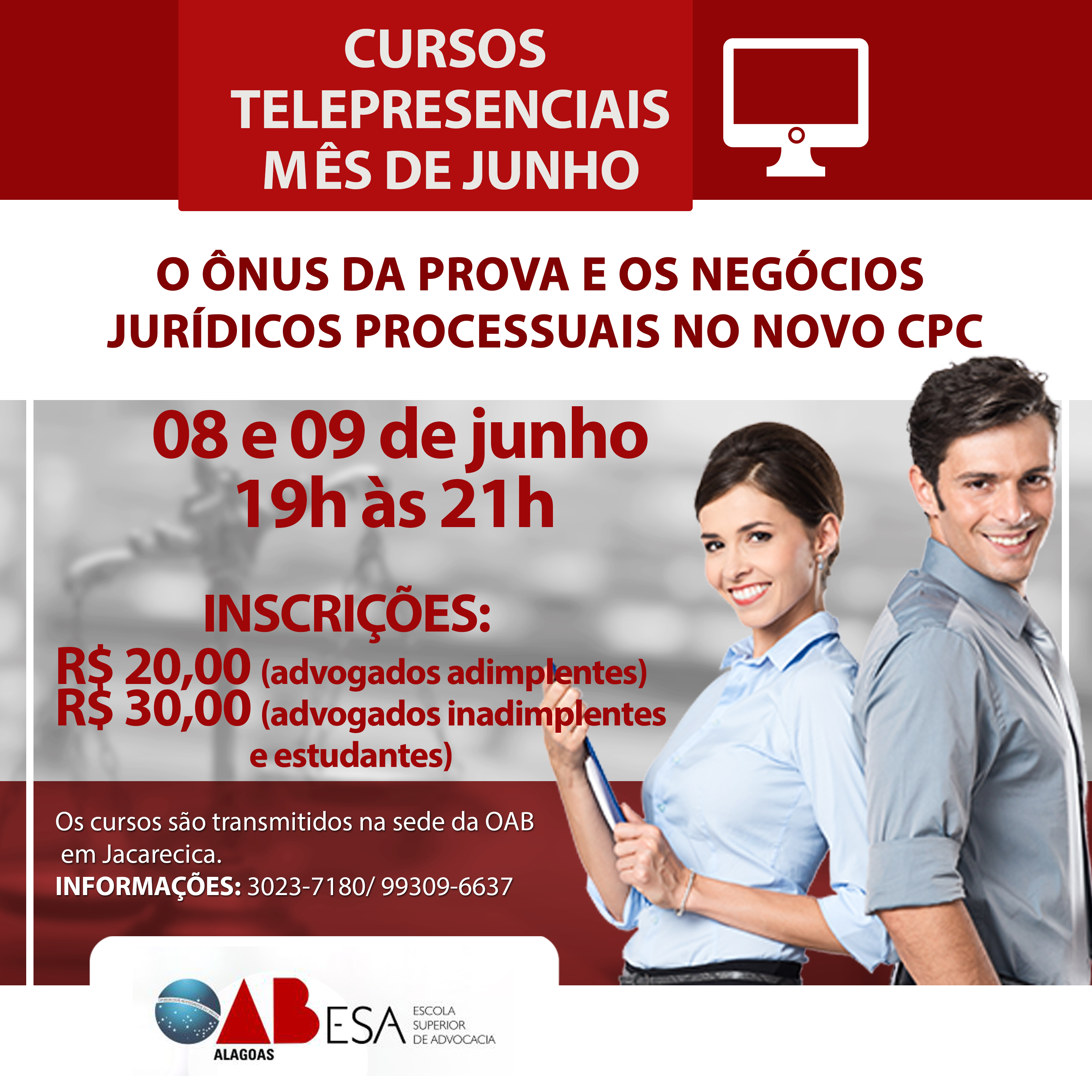 O mês de junho começa na Escola Superior de Advocacia (ESA) da Ordem dos Advogados do Brasil Seccional Alagoas (OAB/AL) com mais um curso sobre o novo Código de Processo Civil (CPC). Com o tema “O Ônus da Prova e os Negócios Jurídicos Processuais no Novo CPC”, o curso telepresencial acontece nos dias 8 e 9 de junho.