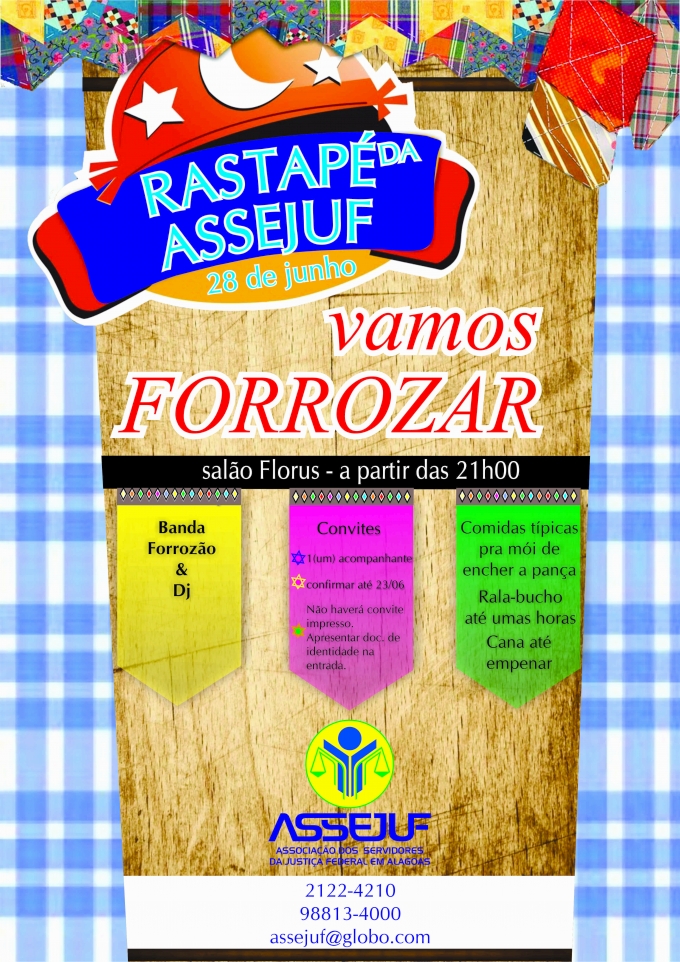 No dia 28 de junho a partir das 21h30, no salão Florus, será realizada a festa junina, o tradicional Rastapé da Assejuf/AL (Associação dos Servidores da Justiça Federal em Alagoas), com muito forró “para lustrar a fivela e comidas típicas para encher o bucho”.