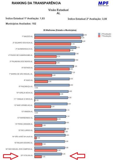 Nesta avaliação, o portal da transparência da Prefeitura de Atalaia obteve a nota 5,3 em uma escala de 0 a 10. Já na classificação que leva em conta a avaliação de todos os portais dos 102 municípios alagoanos, a cidade ocupou a posição de número 20 no ranking. Vale ressaltar, que ao assumir a gestão em setembro de 2014, além dos problemas administrativos e financeiros que o prefeito Zé do Pedrinho herdou, naquela ocasião, aControladoria-Geral da União (CGU) já havia avaliado o município com nota zero.