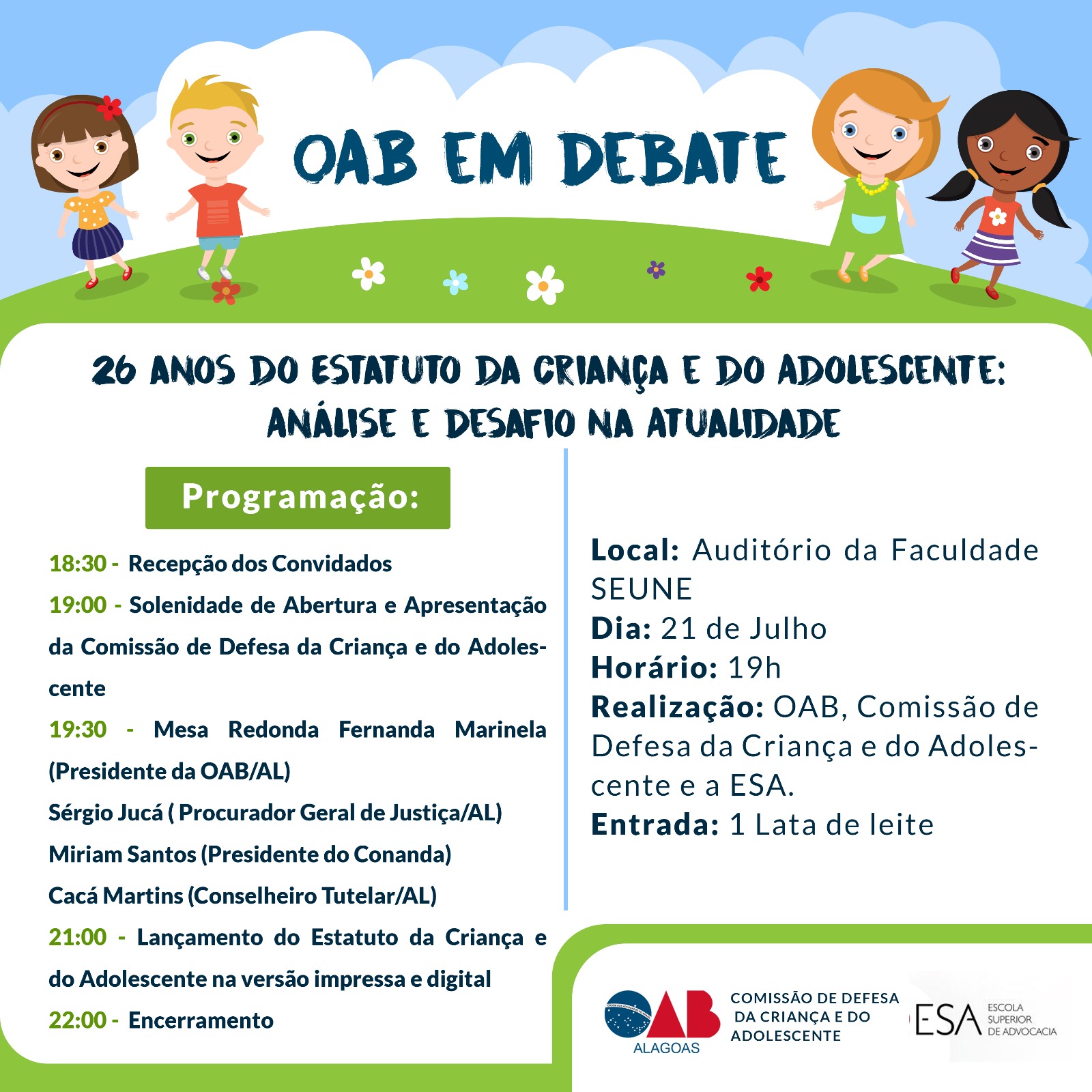 Para relembrar a data, a Ordem dos Advogados do Brasil Seccional Alagoas (OAB/AL), através da Comissão de Defesa da Criança e do Adolescente, realiza no próximo dia 21 de julho uma Mesa Redonda com o tema: “26 anos do Estatuto da Criança e do Adolescente: Análise e Desafio na Atualidade”. O evento integra o projeto OAB em Debate e acontece no auditório da Faculdade SEUNE, em Maceió, a partir das 19 horas.
