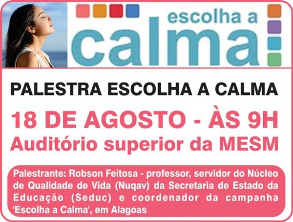 Promover a escolha consciente pela paz e a não-violência na sociedade são motivos fundamentais e urgentes para a realização de campanhas e projetos que atinjam o maior número de pessoas positivamente. Com este propósito, a Coordenação de Desenvolvimento de Pessoas (CDP) da Maternidade Escola Santa Mônica (MESM) convidou o professor Robson Feitosa para ministrar a palestra ‘Escolha a calma’, na próxima quinta-feira (18), às 9h, no auditório superior da maternidade.