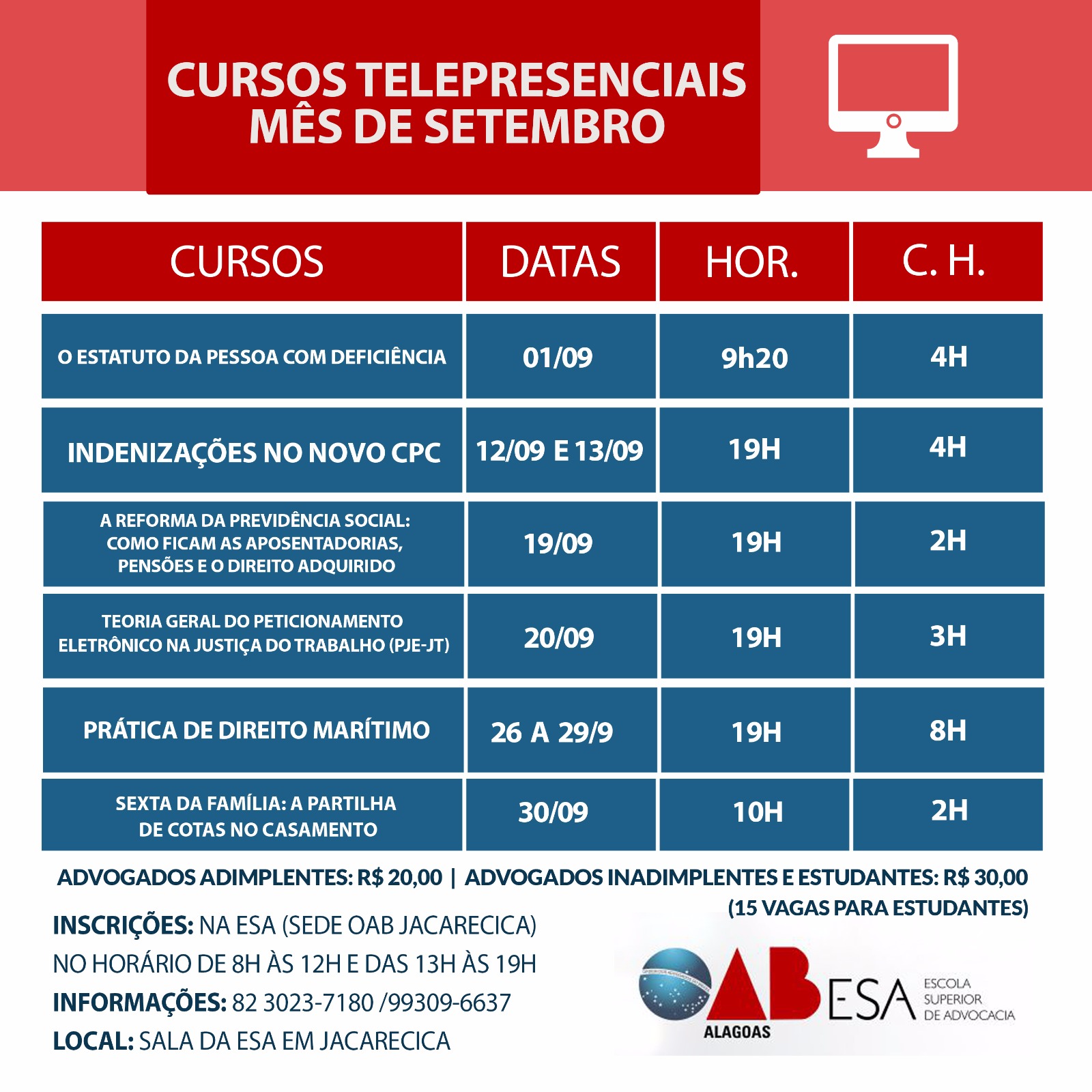A programação dos cursos começa no dia 1º e seguem até o dia 30 de setembro, com temas sobre “O Estatuto da Pessoa com Deficiência”, “Indenizações no novo CPC”, “A reforma da Previdência Social: como ficam as aposentadorias, pensões e o direito adquirido”, “Teoria geral do peticionamento eletrônico na Justiça do Trabalho (PJe-JT)”, “Curso Prática de Direito Marítimo” e “Sexta da Família: a partilha de cotas no casamento”.