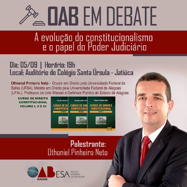 O Direito Constitucional será o tema do OAB em Debate que acontece na próxima segunda, 5 de setembro, em Maceió. O evento, que é mais uma realização da Escola Superior de Advocacia (ESA) em parceria com a Faculdade Estácio FAL, localizada no bairro de Jatiúca, acontecerá no auditório do Colégio Santa Úrsula e terá como palestrante o defensor público de Alagoas, Othoniel Pinheiro Neto.