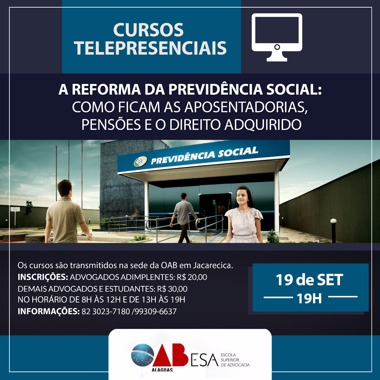 A programação dos cursos telepresenciais da Escola Superior de Advocacia (ESA) continua no dia 19 de setembro, com uma temática que tem gerado bastante interesse para à advocacia “A reforma da Previdência Social: como ficam as aposentadorias, pensões e o direito adquirido”. A aula será transmitida na sede da Ordem dos Advogados do Brasil Seccional Alagoas (OAB/AL), no bairro de Jacarecica, a partir das 19 horas.