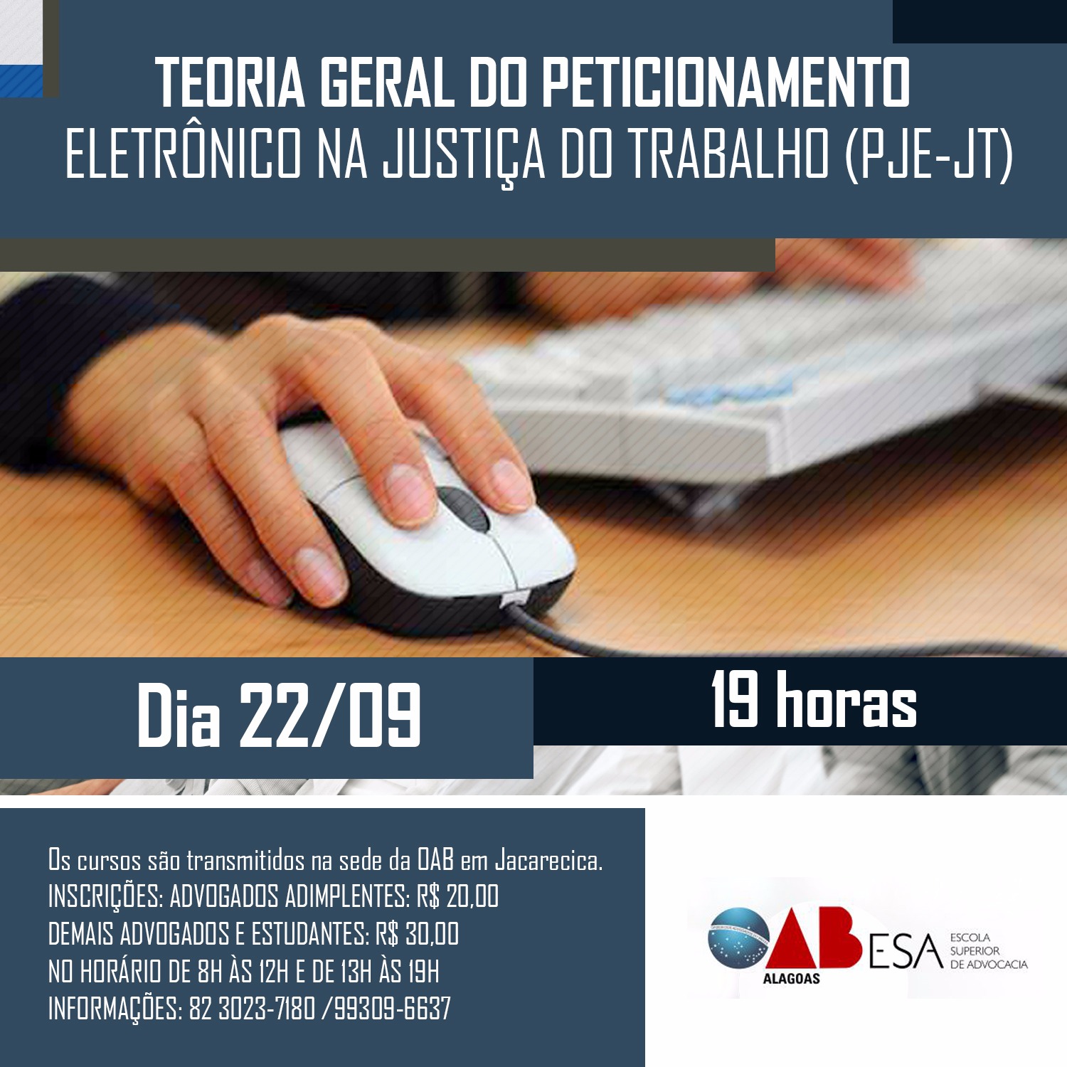 A Teoria geral do peticionamento eletrônico na Justiça do Trabalho (PJe-JT) será um dos temas debatidos durante o curso telepresencial realizado pela Escola Superior de Advocacia (ESA), no próximo dia 22 de setembro. A transmissão da aula acontecerá a partir das 19 horas, e terá carga horária de 3 horas, e acontece na sede da Ordem dos Advogados do Brasil Seccional Alagoas (OAB/AL), no bairro de Jacarecica.