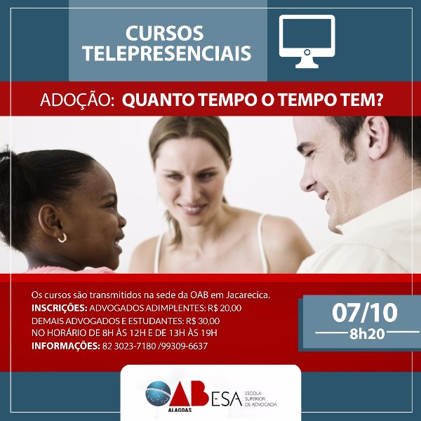 A Ordem dos Advogados do Brasil Seccional Alagoas (OAB/AL), por meio da Escola Superior de Advocacia (ESA), estará ofertando no dia próximo dia 07 de outubro o curso “Adoção: quanto tempo o tempo tem?”. As aulas telepresenciais terão início às 8h20, na sede da Ordem, no bairro de Jacarecica, com término previsto para às 18h10.