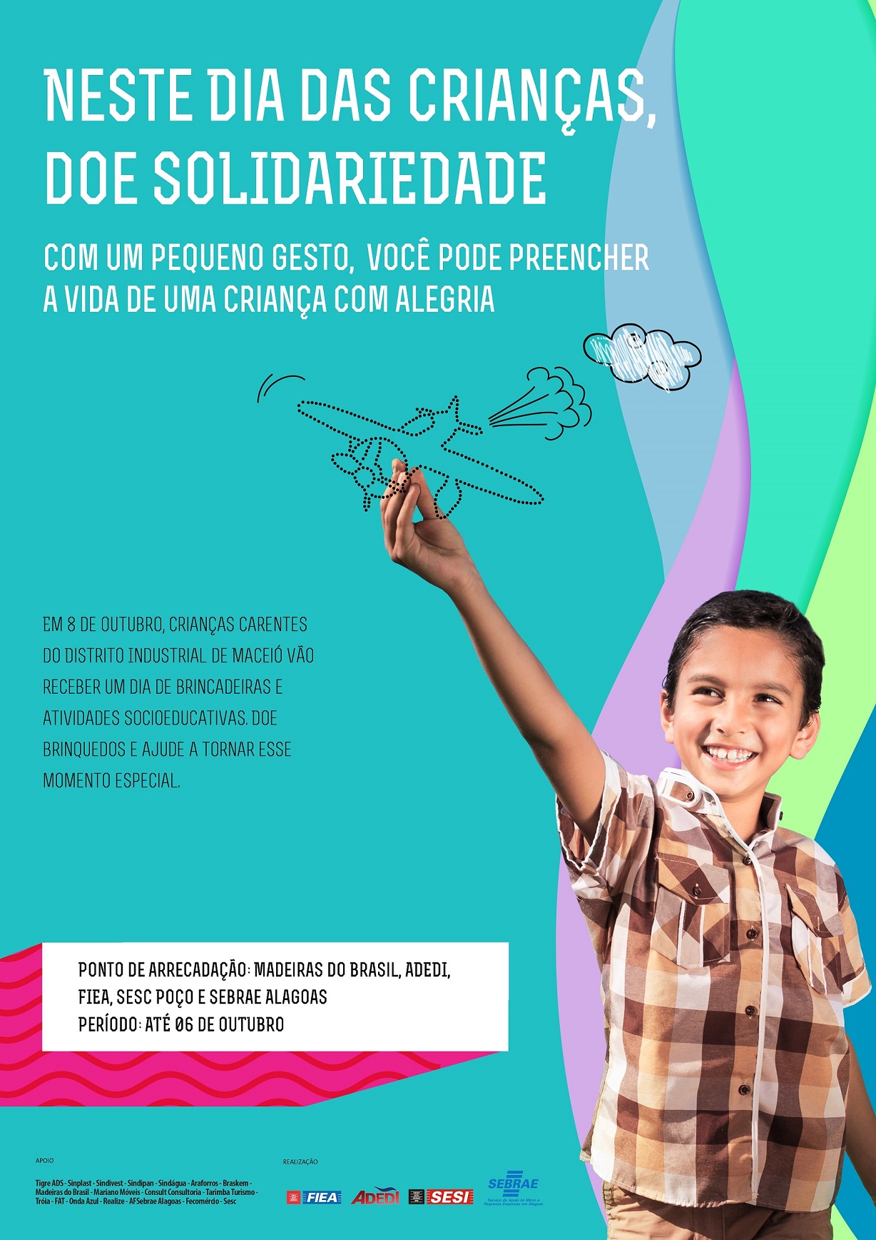 Com o intuito de celebrar o Dia das Crianças, o Sebrae em Alagoas, a Federação das Indústrias do Estado de Alagoas (Fiea), a Associação do Polo Multissetorial Governador Luiz Cavalcante (Adedi) e seus parceiros realizarão, no próximo sábado (08), às 13h, na Unidade do Serviço Social da Indústria (Sesi/AL) no Distrito Industrial, uma ação social com 1.200 crianças de até 12 anos, moradoras da região, e filhos de funcionários das empresas do polo.