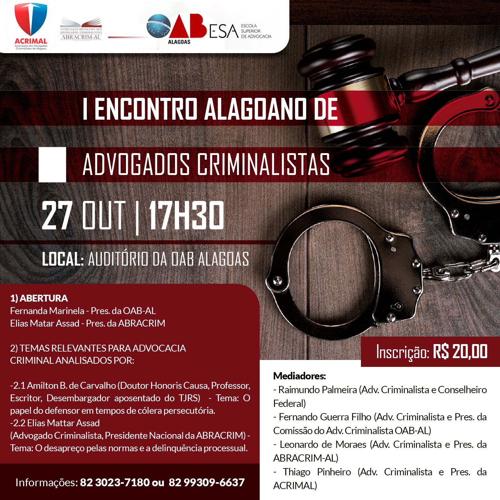 O I Encontro Alagoano de Advogados Criminalistas terá como mediadores o advogado criminalista e conselheiro federal, Raimundo Palmeira; o advogado criminalista e presidente Comissão do Advogado Criminalista da OAB-AL, Fernando Guerra Filho; o advogado criminalista e presidente da Abracrim-AL, Leonardo de Moraes; e o advogado criminalista e presidente da Acrimal, Thiago Pinheiro.