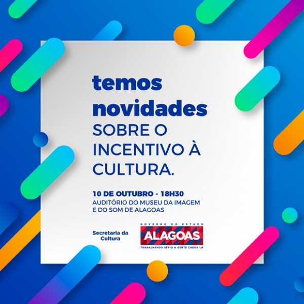 A Secretaria de Estado da Cultura (Secult) promove nesta terça-feira (10), às 18h30, no Museu da Imagem e do Som de Alagoas (Misa), reunião com a comunidade cultural para repasse dos novos procedimentos de Incentivo à Cultura. Na ocasião, será apresentado o trâmite do Instrumento de Incentivo, discutida no Encontro Municipalista, em Maragogi, e com a comunidade cultural em Maceió, em agosto deste ano.