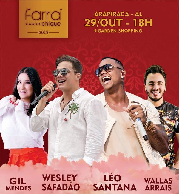 Atrações: Wesley Safadão, Léo Santana, Gil Mendes e Wallas Arrais Quando: 29 de OUTUBRO de 2017 Onde: Arapiraca – Alagoas às 18 horas Vendas Online: http://farrachique.com.br/event/8382 Realização: Farra Chique Entretenimento e Barrera Produções
