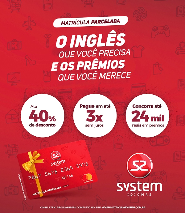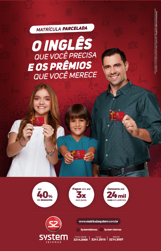 A campanha de matrícula parcelada da System Idiomas vem para facilitar a garantia de uma experiência bilíngue numa das melhores escolas de inglês do Brasil, com método exclusivo para seus alunos. Para mais informações sobre o regulamento e datas da campanha, a escola disponibiliza suas redes sociais oficiais e o site www.matriculasystem.com.br, além do telefone 3214-3060.