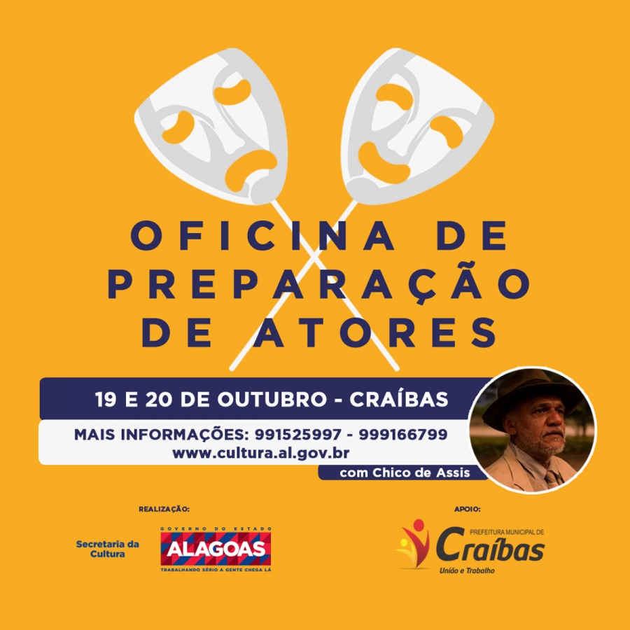 A Oficina de Preparação de Atores, promovida pelo Governo de Alagoas, por meio da Secretaria de Estado da Cultura (Secult), chega este mês ao município de Craíbas, agreste alagoano. As aulas acontecerão nos dias 19 e 20 de outubro, no Auditório Municipal Chico do leite. As inscrições são gratuitas.