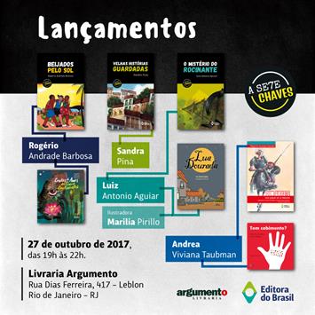 No dia 27 de outubro, das 19h às 22h, na Livraria Argumento (Rua Dias Ferreira, 417 – Leblon - RJ) a Editora do Brasil reunirá quatro autores de seus recentes lançamentos infantojuvenis para evento de autógrafos. Rogério Andrade apresentará as obras Beijados pelo sol e Contos de amor dos cinco continentes, Sandra Pina apresentará a obra Velhas Histórias guardadas, Luiz Antônio Aguiar lançará as obras Lua Dourada e O mistério do Rocinante e Andrea Viviana Taubman lançará as obrasDom Quixote e Tem cabimento? O evento será aberto ao público.
