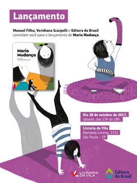 No dia 28 de outubro, das 15h às 18h, na Livraria da Vila(Alameda Lorena, 1731- São Paulo – SP) Manuel Filho e Veridiana Scarpelli lançam a obra infantojuvenil Maria mudança. O livro apresenta de modo bastante criativo o cotidiano de Maria e suas tentativas (às vezes malucas) de mudar as coisas para melhor. Uma reflexão sobre mudança, respeito às diferenças e de perseverança são as principais mensagens desse livro colorido e muito divertido, que dialoga com o leitor de um jeito novo e muito bacana. Preparem-se para as mudanças que essa personagem vai causar na vida de todo mundo. O evento também será aberto ao público.