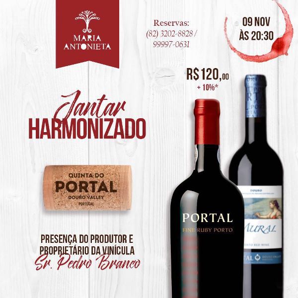 A Quinta do Portal, uma das mais premiadas e respeitadas vinícolas portuguesas da região do Douro, comanda um jantar especial nesta quinta-feira (9/11), às 20h30, no restaurante Maria Antonieta. Com a presença do produtor e proprietário da vinícola, o português Pedro Branco, cinco rótulos serão apresentados e comentados (Espumante Mural Reserva Brut, Mural Tinto Red, Portal Colheita Tinto Douro, Portal Reserva Tinto Douro e Porto Quinta do Portal Ruby), cada um deles harmonizado com um prato assinado pelo chef Breno Gama, como Arancini Siciliani, Ravioli de Ossobuco e Lasagna al Tartufo.