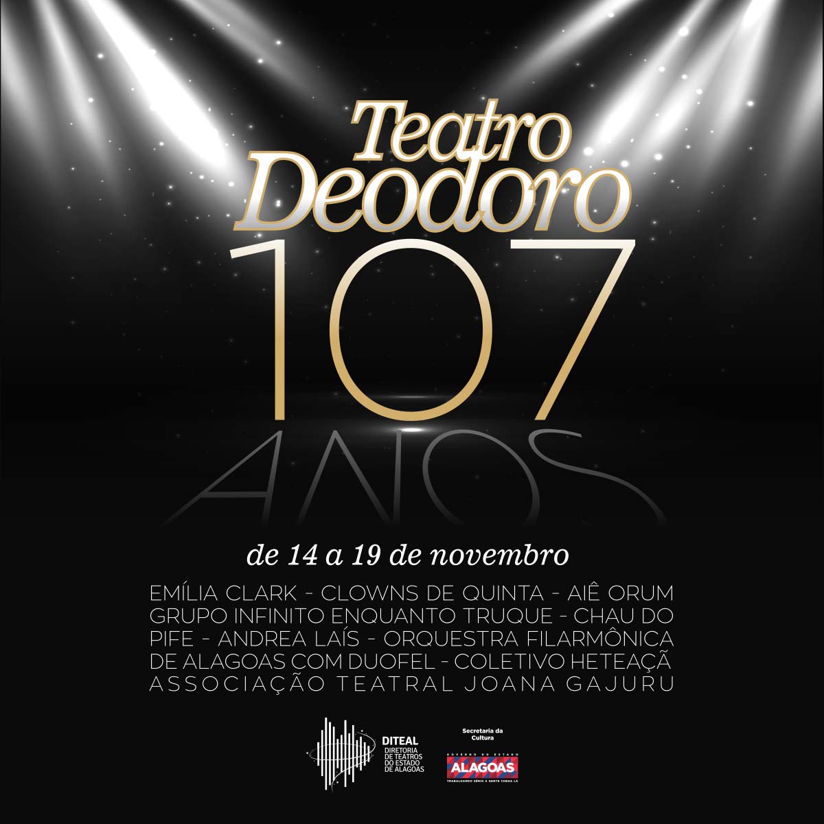 Para comemorar o aniversário de 107 anos do teatro, a Diretoria de Teatros do Estado de Alagoas (Diteal) preparou uma programação especial, que vai do dia 14 a 19 de novembro, com apresentações na praça e no Teatro Deodoro, com diversas linguagens artísticas como dança, palhaçaria, teatro e música. A maior parte da programação é gratuita.