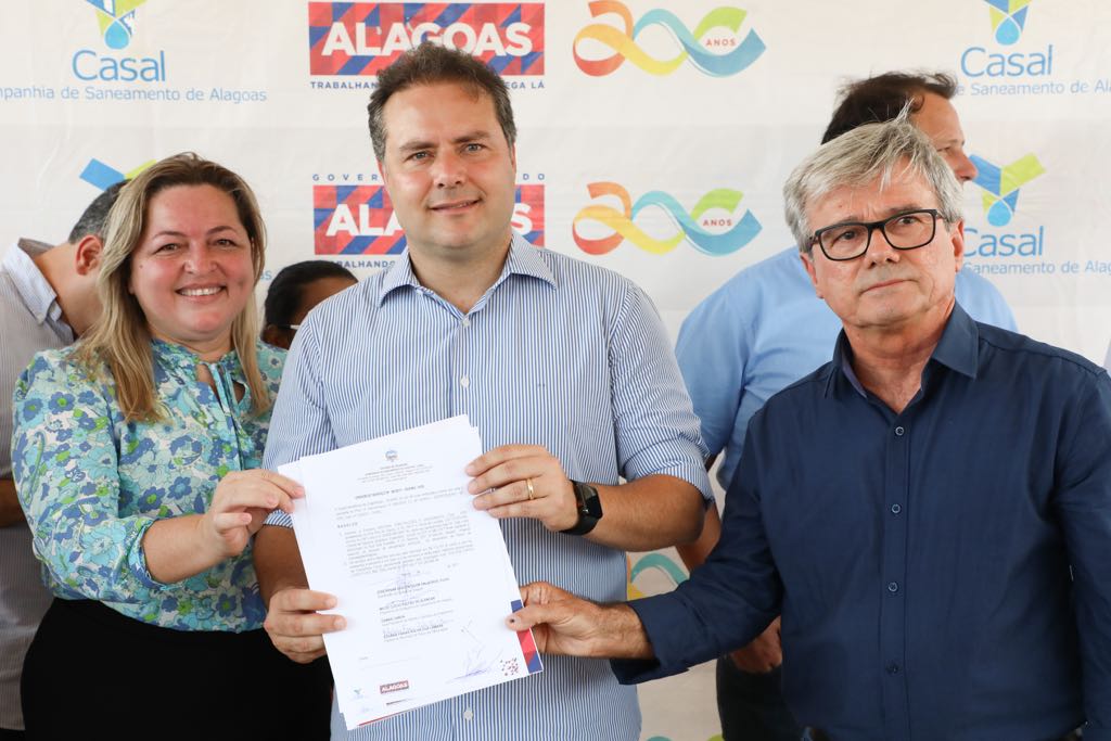 O governador Renan Filho e o presidente da Companhia de Saneamento de Alagoas (Casal), Clécio Falcão, assinaram, na manhã desta segunda-feira (13), em Passo de Camaragibe, a ordem de serviço para a recuperação do reservatório apoiado de água tratada do município, situado no Litoral Norte.