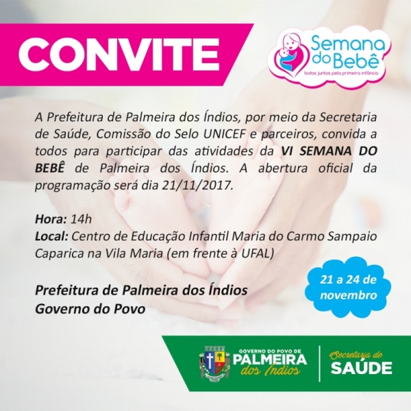 A Prefeitura de Palmeira dos Índios, por meio da Secretaria Municipal de Saúde, comissão do Selo Unicef e parceiros, dará início a VI Semana do Bebê do município na próxima terça-feira (21). Com o tema “Todos juntos pela primeira infância”, a Semana do Bebê acontecerá de 21 a 24 de novembro e envolverá órgãos que trabalham diretamente com crianças, como creches, escolas, Ministério Público e secretarias municipais.