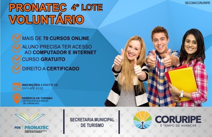A prefeitura municipal de Coruripe através da Gerência de Turismo está com inscrições abertas até o dia 01 de dezembro para as novas vagas dos cursos profissionalizantes oferecidos pelo Programa Nacional de Acesso ao Ensino Técnico e Emprego (Pronatec) em Coruripe.