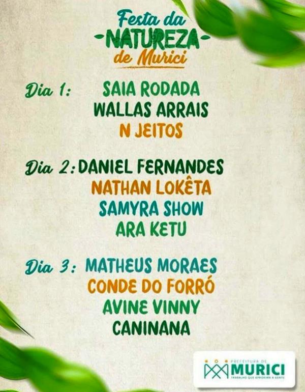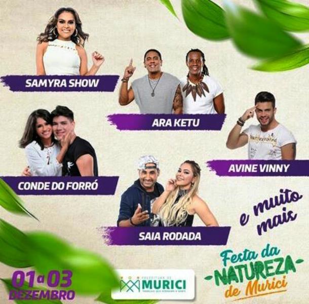 A edição 2017 de um dos maiores festivais de Alagoas vai unir natureza, gastronomia, esporte, cultura e sustentabilidade em um só lugar! Há 12 anos estabelecida no calendário cultural de Alagoas, a Festa da Natureza de Murici vai trazer de volta todo o vigor da parte sustentável, cultura, turismo e esportes numa programação rica e diversificada, além, é claro, dos grandes shows que abrilhantam ainda mais a festa.