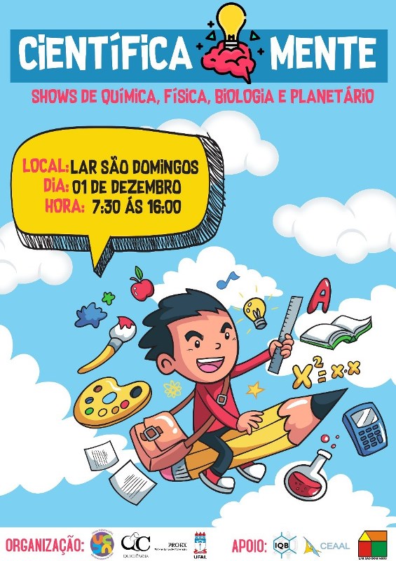 Nesta sexta-feira (1/12), o Lar São Domingos vai se transformar praticamente em uma usina de ciências, com shows de Química, Física e Biologia. Das 7h30 às 16h, diversos espaços da instituição filantrópica serão ocupados pelo Projeto Científica Mente, da UFAL. Além de variado número de atividades nessas áreas do conhecimento, o projeto vai trazer também o Planetário, que envolve outros saberes, como engenharia e astronomia.