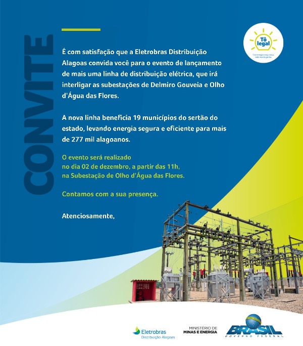 Representantes da Eletrobras Distribuição Alagoas estarão no próximo sábado (02) no município de Olho d’Água das Flores para realizar a inauguração da nova linha de Distribuição que interliga a subestação do município com a de Delmiro Gouveia. O evento começará às 11h na subestação e terá a participação do ministro de Minas e Energia, Fernando Coelho Filho, do ministro do Turismo, Marx Beltrão, e de autoridades dos municípios beneficiados.