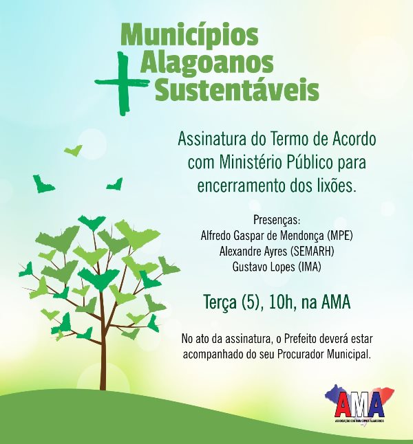 A preocupação com o Meio Ambiente e o respeito a legislação vigente ,que determina o fim dos lixões, também é uma bandeira da Associação dos Municípios Alagoanos (AMA) que tem promovido uma série de debates sobre o assunto e vem acompanhando o posicionamento dos órgãos de fiscalização. O cumprimento da Lei de Resíduos Sólidos é o objetivo dos prefeitos que , através da Associação e da CNM têm se posicionado sobre a importância dela e a defesa da aplicabilidade , principalmente quando se fala em transferência de responsabilidade , sem dotação orçamentária.