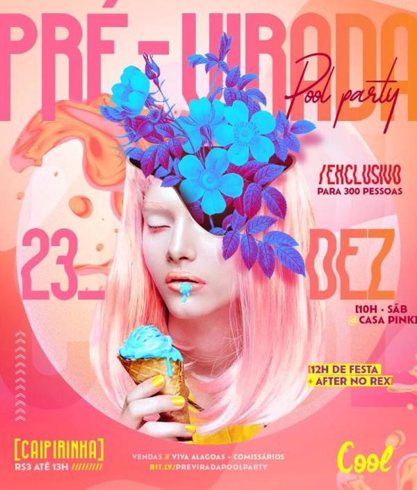 Se você, assim como a galera da COOL, já estão no clima festivo de fim de ano e contando os dias para a noite de réveillon, já pode ficar animado. A produtora, que este ano prepara seu primeiro réveillon, o Virada 2018, realiza neste sábado, 23, a 'Pré-virada', iniciando a comemoração em uma Pool Party, na Casa Pink, localizada no Barro Duro, das 10h às 22h, somente para as 300 primeiras pessoas que adquirirem o ingresso. E, para finalizar o dia, um after no Rex Jazz Bar, no Jaraguá, das 23h às 5h do dia seguinte.