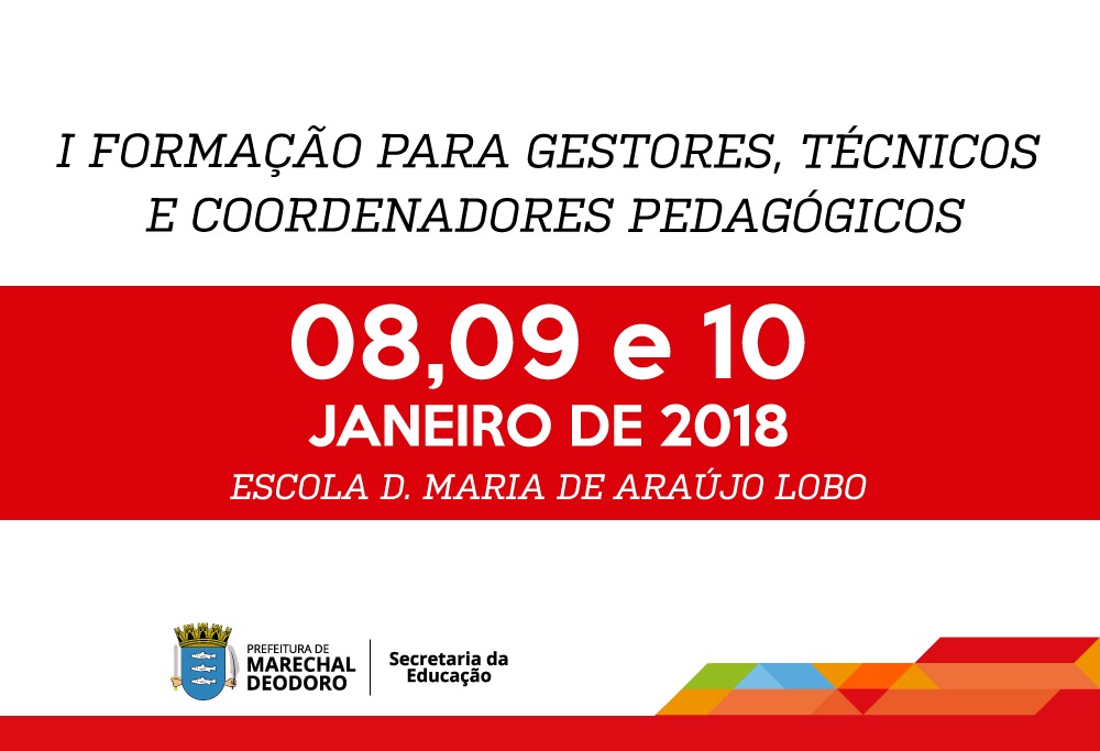 A Prefeitura de Marechal Deodoro, por meio da Secretaria Municipal de Educação (SEMED), inicia, na próxima segunda (08), a I Formação do Ano Letivo de 2018 para Diretores e Coordenadores Pedagógicos da Rede Municipal de Ensino. Com encerramento na quarta-feira (10), a capacitação se baseará na utilização de uma metodologia para padronização do ensino municipal.