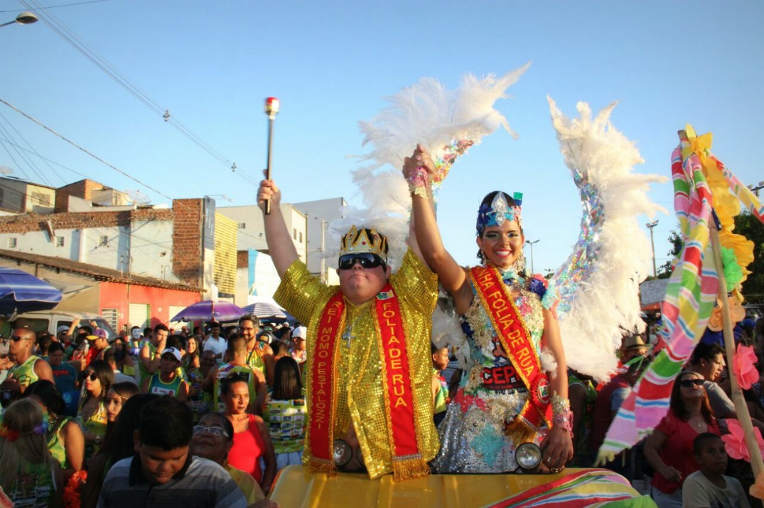 O Rei Momo da Pestalozzi, Daniel Chaves, ao lado da nossa Rainha do Carnaval 2017, Fernanda Duarte, abrindo alas para a epifania da alegria (Foto: Samuel Alves/ arquivo)
