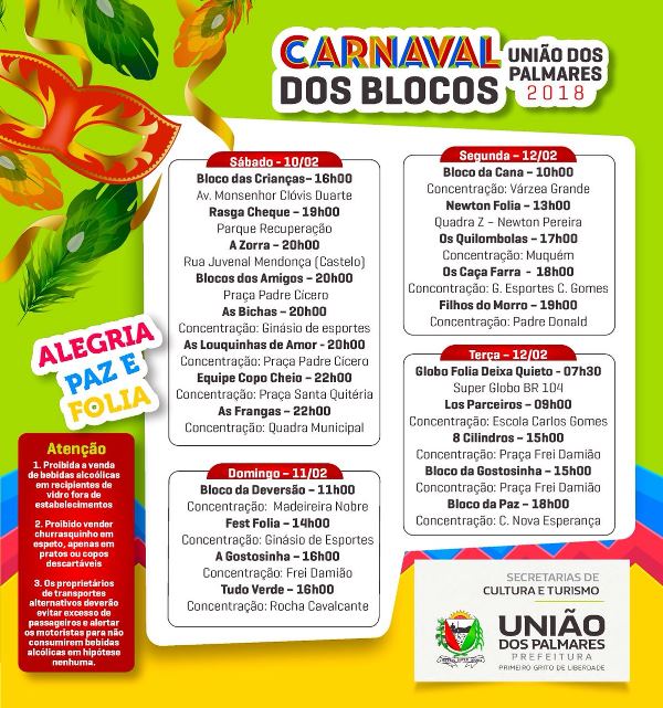 Em sua programação em alusão ao período de carnaval, a prefeitura de União dos Palmares, através das Secretarias de Cultura e Turismo, vai apoiar os blocos festivos do município, dando continuidade a um trabalho de resgate de tradições da realização desses blocos pela cidade que vem sendo desenvolvido desde o ano passado, primeiro ano de mandato da atual gestão. O cronograma de blocos começa neste sábado (10/02) e prossegue até terça-feira (13/02).