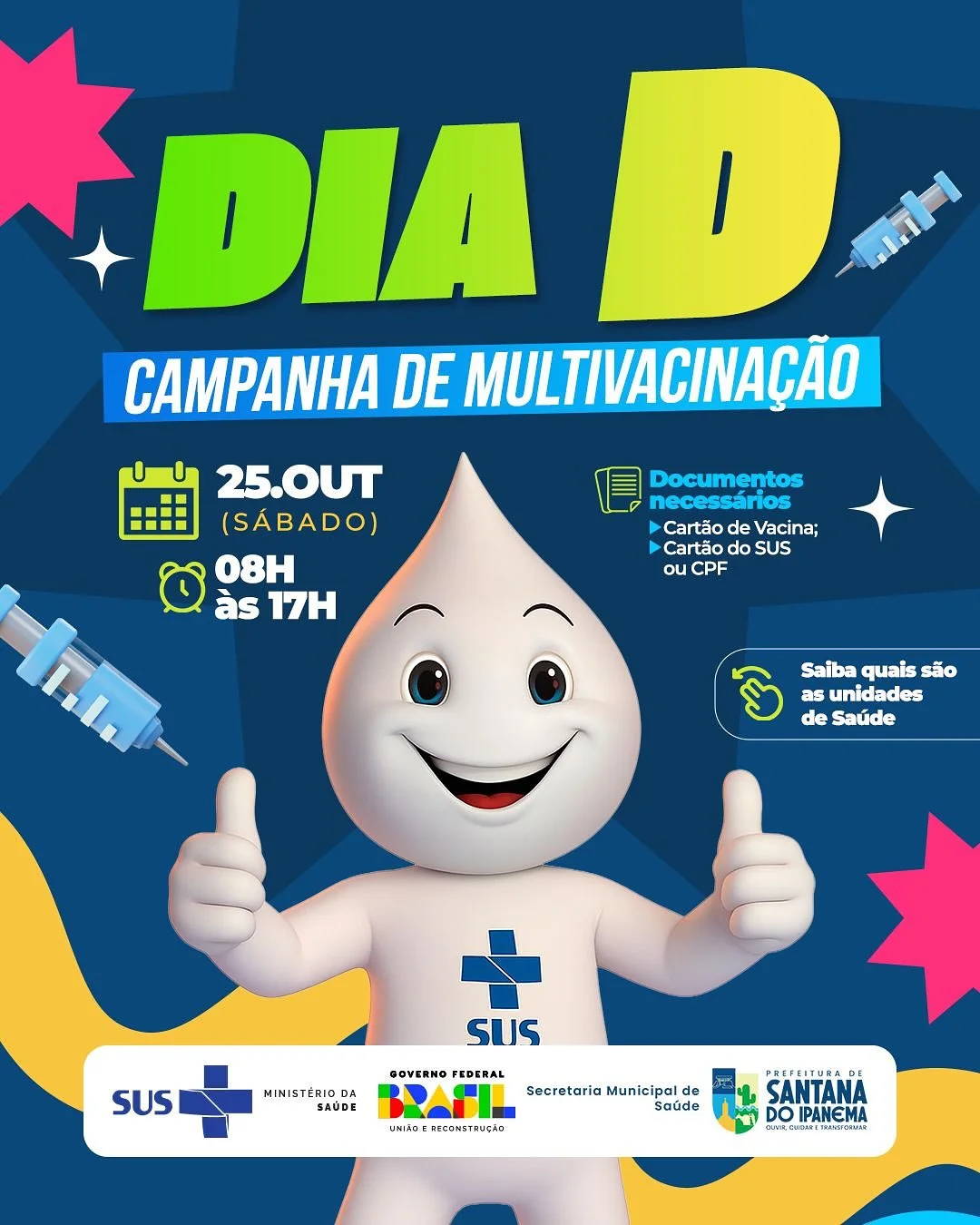 A Prefeitura de Santana do Ipanema, por meio da Secretaria Municipal de Saúde, realiza neste sábado (25), o Dia D da Campanha de Multivacinação. A imunização acontece com pontos fixos na Praça Dr. Adelson Isaac de Miranda, Secretaria de Saúde e a Unidade Santa Ana, além de casa a casa nas UBSs Santa Luzia e São Pedro, das 8h às 17h. O público-alvo da multivacinação, para a atualização das vacinas de rotina, são os menores de 15 anos.