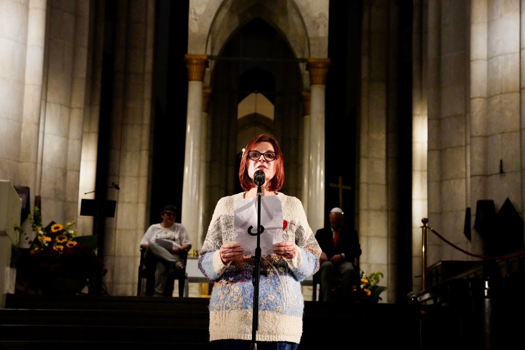 HISTÓRIA E MEMÓRIA – Dezenas de pessoas que estiveram no primeiro ato e voltaram para a catedral 50 anos depois foram aplaudidas de pé. Também compareceram ao evento organizado pelo Instituto Vladimir Herzog e a Comissão Arns religiosos, parlamentares, artistas, jornalistas e representantes de instituições que defendem os direitos humanos e causas humanitárias.