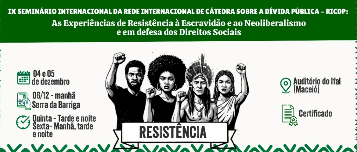 Alagoas será palco de um dos mais importantes encontros internacionais sobre economia política, história e direitos humanos: o IX Seminário Internacional da Rede Internacional de Cátedras sobre a Dívida Pública (RICDP). O evento, que traz como tema “As Experiências de Resistência à Escravidão e ao Neoliberalismo e em Defesa dos Direitos Sociais”, ocorrerá no auditório do Instituto Federal de Alagoas (IFAL) – Campus Maceió (Centro), nos dias 4 e 5 de dezembro, e o encerramento no dia 6 de dezembro, será realizado em um espaço de profunda simbologia histórica: a Serra da Barriga, em União dos Palmares (AL).