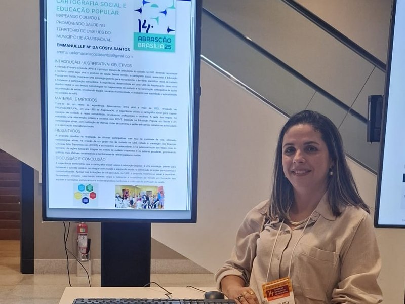 Os técnicos de Arapiraca Emamanuelle Santos, Murillo Nunes, Érica Barbosa e Danielle Chalub, apresentaram sete trabalhos no evento: cartografia social e educação popular: mapeando cuidado e promovendo saúde no território de uma UBS do município de Arapiraca/AL; do diagnóstico à ação coletiva: construindo o plano de ação participativa de uma UBS no município de Arapiraca/AL; sistema de gestão de órteses, próteses e meios; auxiliares de locomoção - SGOPM -: uma estratégia de saúde digital.