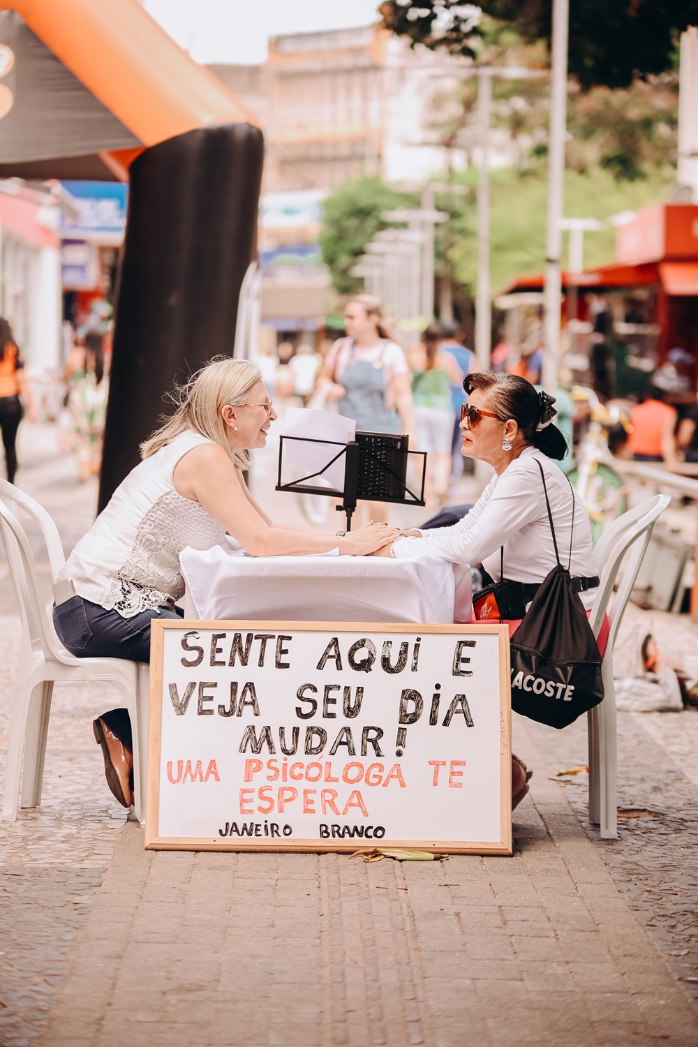 Nesta terça-feira (13), a campanha foi às ruas para promover um momento de leveza e apoio emocional à população. O projeto “Dia Branco” levou uma profissional de psicologia para a Praça Marques da Silva, no Centro da cidade, para oferecer palavras de conforto e alívio. A iniciativa foi da Coordenação de Saúde Mental e contou com a presença da equipe técnica da SMS.
