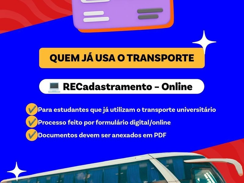 A convocação serve para os alunos que já cursam e precisam fazer o recadastramento e os novatos realizarem o cadastro para utilização dos transportes para as faculdades. Para os estudantes que já utilizam os transportes o recadastramento será de forma online, onde será possível anexar os documentos pelo formulário disponibilizado.