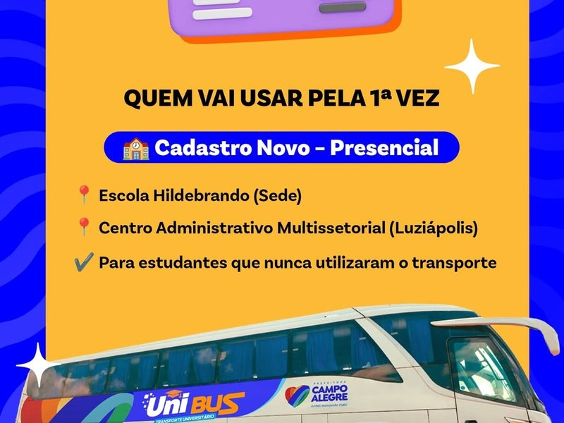 Para os novatos o cadastro acontecerá em Campo Alegre Na Escola Monsenhor Hildebrando Verissimo Guimarães e em Luziápolis no Centro Administrativo Multissetorial localizado na Rua Cândido Teixeira no antigo prédio da Escola Pedro de Oliveira. Os estudantes devem comparecer aos locais de recadastramento no período estabelecido portando comprovante de matrícula atualizado e comprovante de residência atualizado.