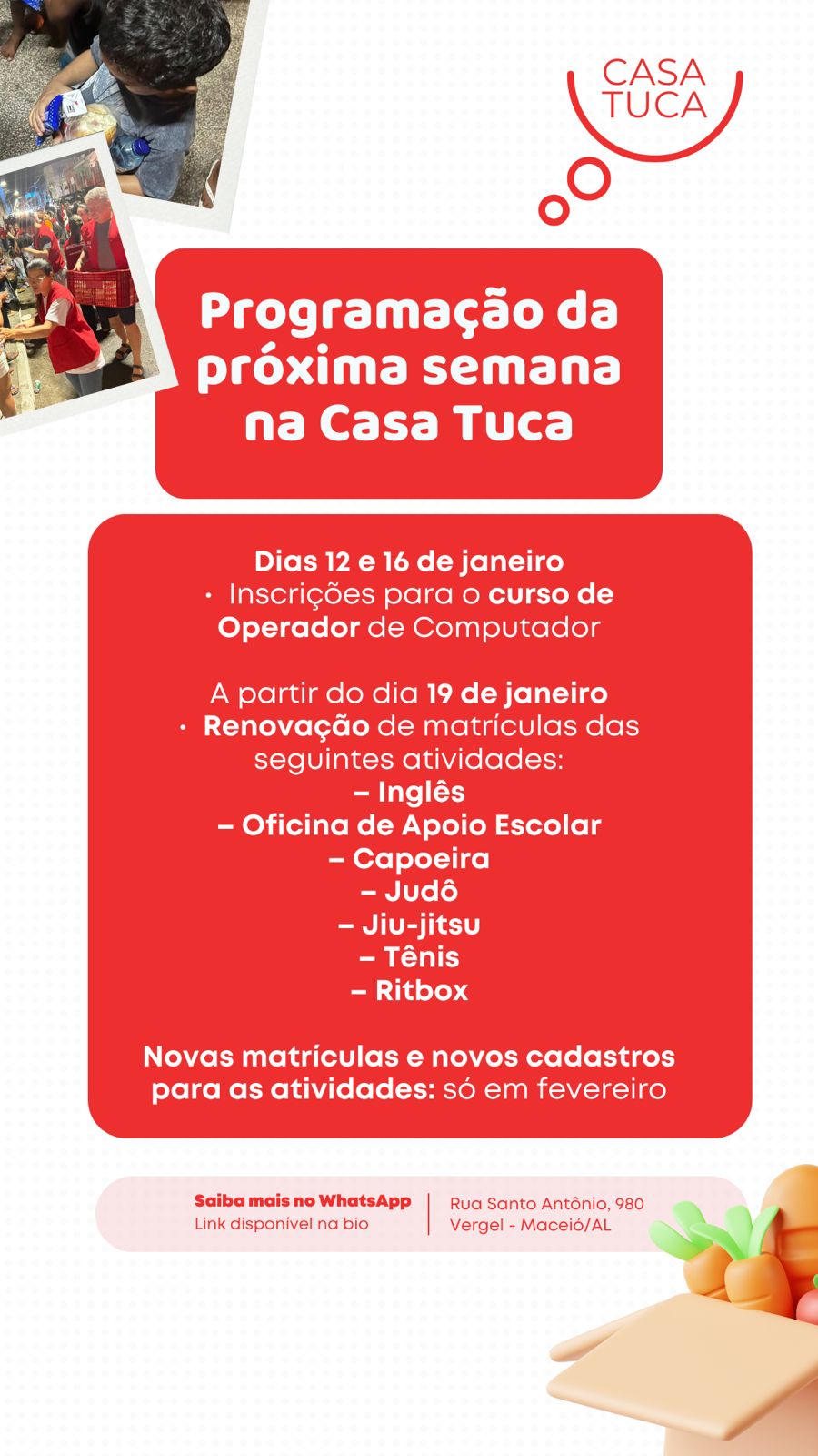 As crianças e adolescentes que são assistidos pela Casa Tuca e frequentaram alguma das atividades ofertadas em 2025 já podem fazer a renovação da matrícula para este ano. As modalidades são inglês, oficina de apoio escolar, capoeira, judô, jiu-jitsu, tênis e ritbox.