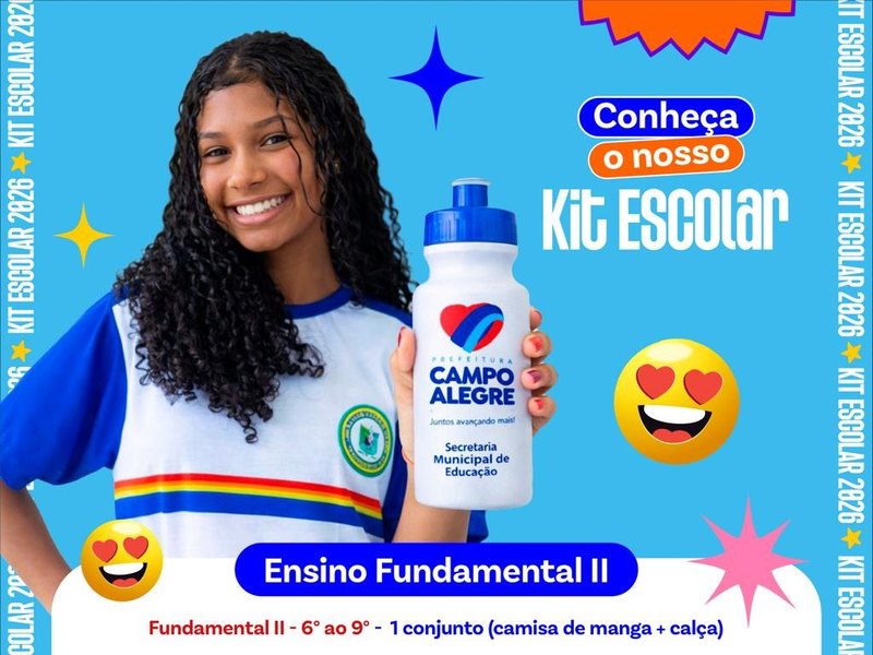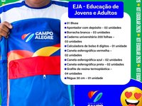 Os kits escolares contarão com materiais diversos, indispensáveis para um bom desenvolvimento escolar dos discentes campo-alegrenses, como, por exemplo: Alguns dos itens do kit escolar: Mochila com rodinhas, Mochila escolar, Apontador com depósito, Borracha branca, Cadernos, Canetas, Lápis grafite e lápis de cor, Canetinha hidrográfica, Giz de cera, Guache, Régua, Tubo de cola branca, Fardamento escolar, Garrafinha de água (squeeze), entre outros.