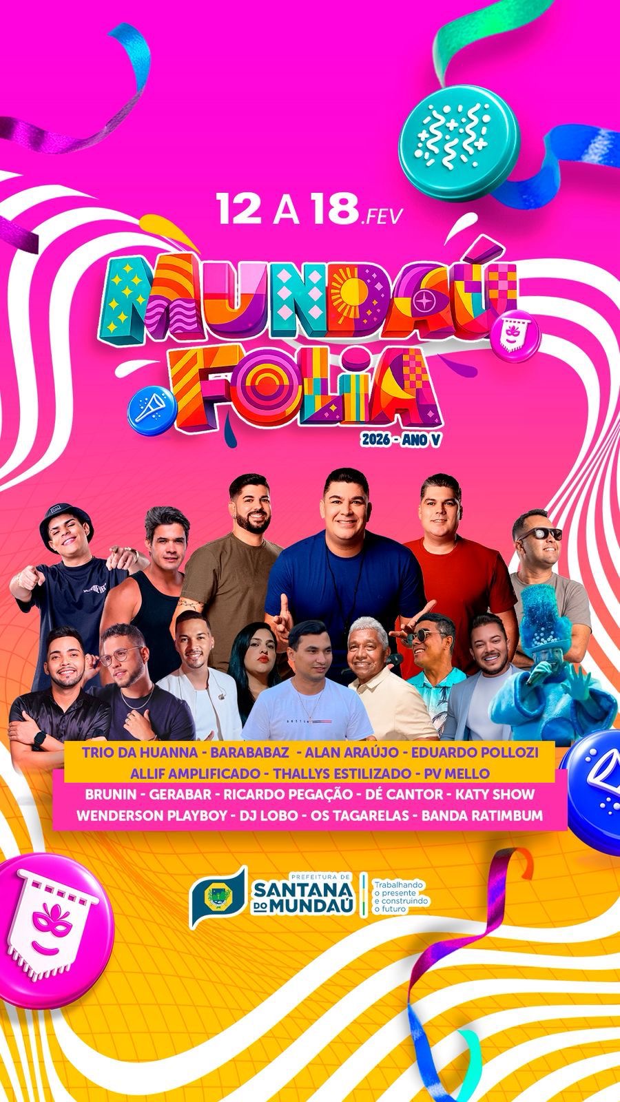 Até a terça-feira (17), diversos blocos farão a alegria dos foliões ao som de: Wenderson Playboy, DJ Lobo, Banda Ratimbum, Os Tagarelas, Eduardo Pollozi, Gerabar, Ricardo Pegação, Dé Cantor, Katy Show, PV Mello, Allif Amplificado, Thallys Estilizado, Alan Araújo e Brunin. Já na quarta-feira de cinzas (18), as bandas Trio da Huanna e Barababaz promoverão um mega arrastão pelas princesas ruas da cidade. “Estão todos convidados”, disse o prefeito André Castro.