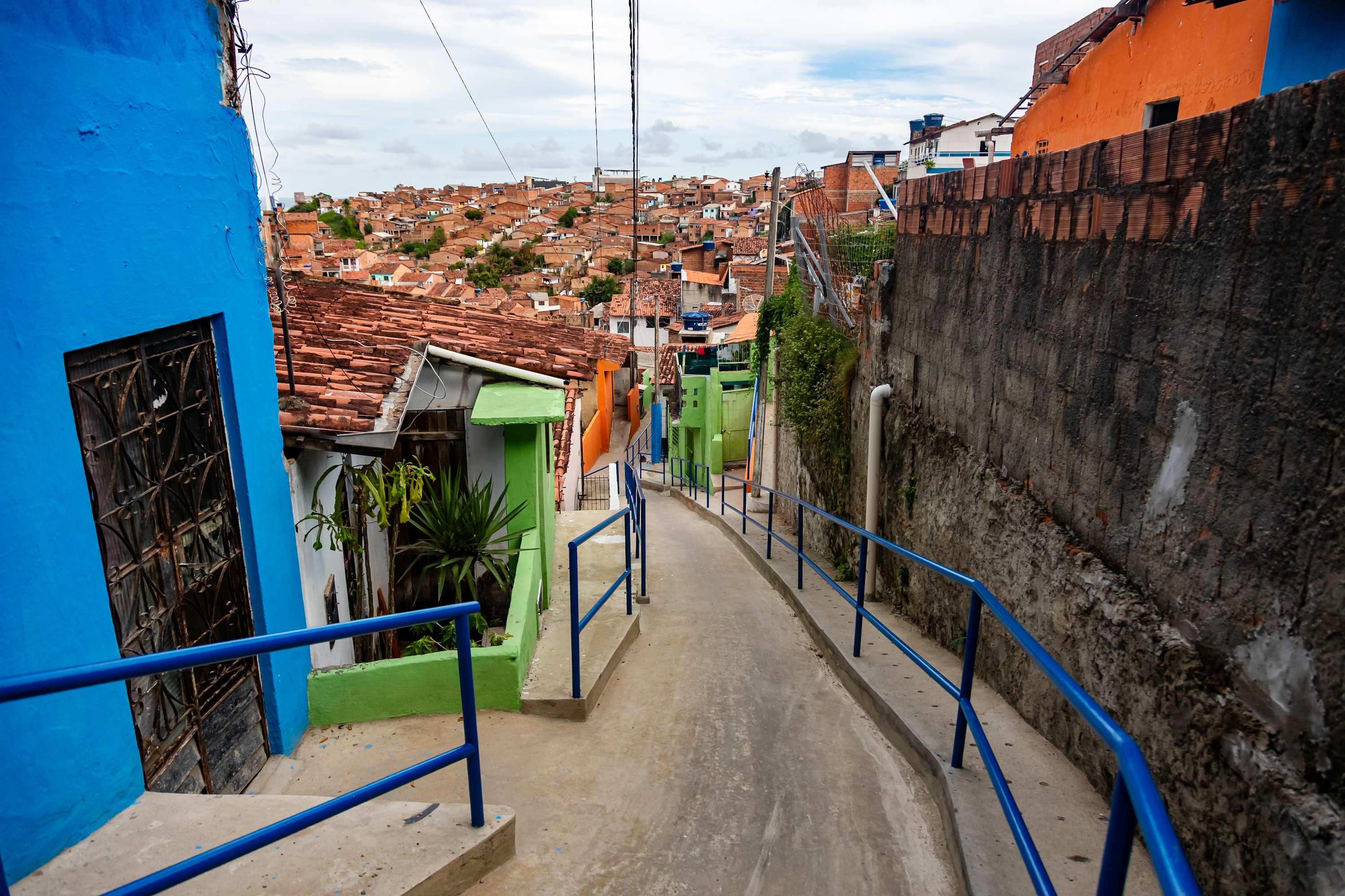 A Grota do Rafael também recebeu importantes obras de proteção de encosta, com um ponto de 1.800 m² entregue em 2022 e outro de 1.500 m² concluído em 2025, garantindo mais segurança para os moradores. Ao todo, estão previstas 27 escadarias: três já finalizadas e outras 24 em execução, facilitando o deslocamento da população.