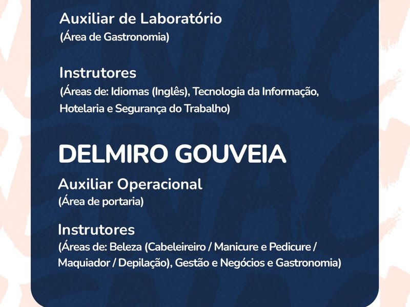 • Instrutores: nas áreas de Beleza (Cabeleireiro/ Manicure e Pedicure / Maquiador), Gastronomia (Serviços de Sala e Bar; Confeitaria) e Saúde (Análises Clínicas).