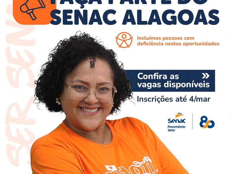 Ao todo, são 39 vagas distribuídas para Arapiraca, Delmiro Gouveia, Maceió, Maragogi e Palmeira dos Índios, podendo contratar ainda mais pessoas de acordo com a demanda e a validade do processo seletivo. Os interessados devem ler os comunicados publicados no site https://al.senac.br/processos-